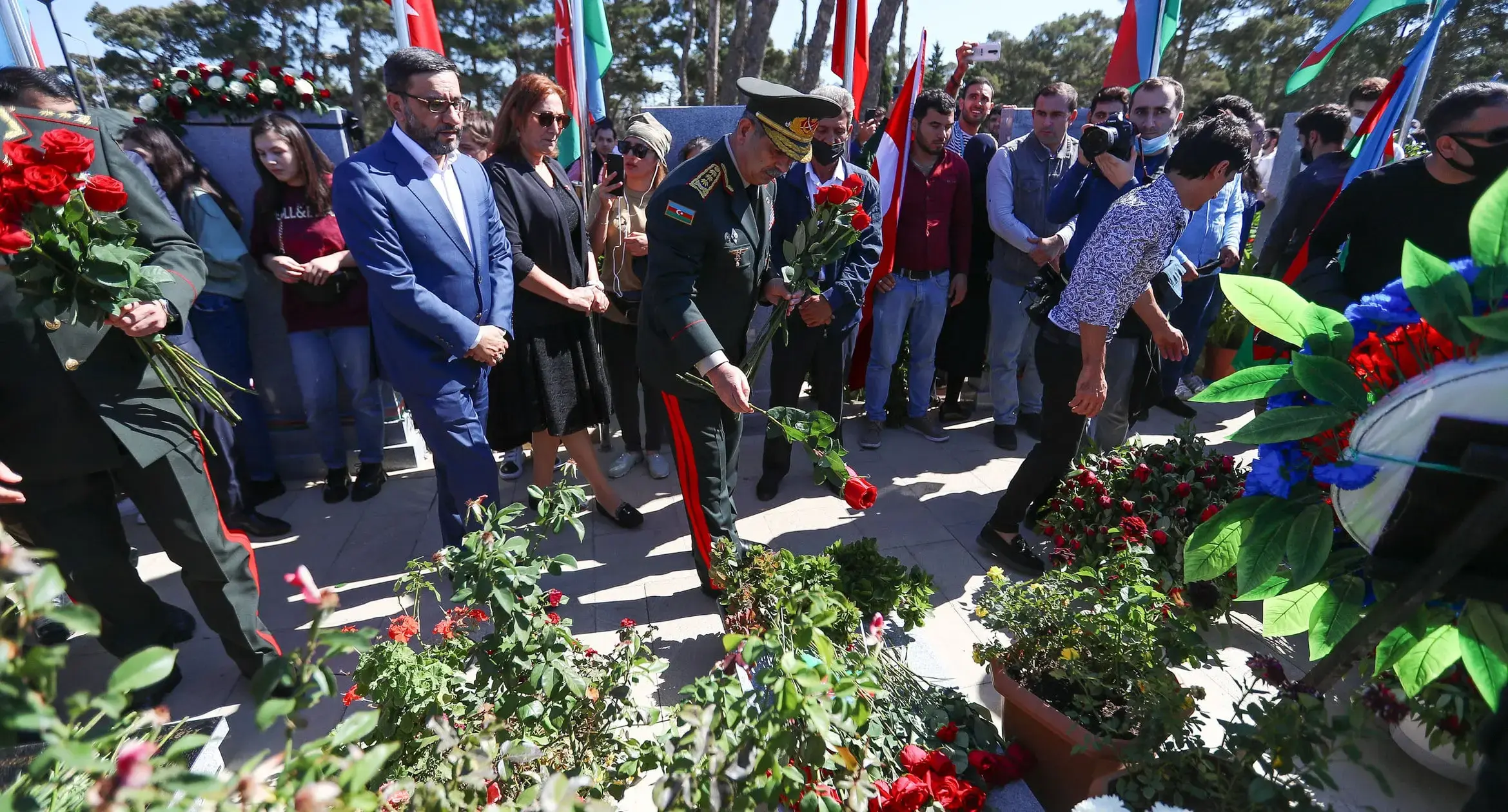On the first anniversary of the beginning of the Patriotic War of Azerbaijan, the relatives of the dead soldiers and residents of Baku came to the Alley of Honor. The memory of those who fell during the hostilities in the fall of 2020 was honored with a minute of silence and prayers. The Minister of Defense of Azerbaijan, Colonel-General Zakir Hasanov, also laid flowers at the graves of the heroes of the war. See photo report prepared by the ‘Caucasian Knot’ correspondent Aziz Karimov.